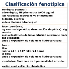 - Hipovolémico: Existen pacientes con volema baja (sangre circulante disminuida). Ello puede ser una condición congénita, genética denominada hipovolemia primaria o bien secundaria a pérdidas de volumen como son la diarrea crónica, menstruación muy abundante, hemorragias. La volemia baja activa el mecanismo de defensa con activación del simpático.